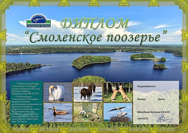 6 сентября 2018 года коллектив радиостанции RK3L/P планирует радиоэкспедицию в Духовщинский район RDA SM-11, для активации диплома «Смоленское поозерье». Будем работать в SBB, CW, BPSK63. Положение о дипломе Получить диплом могут соискатели всего мира, имеющие радиолюбительскую лицензию или SWL позывной. Формат диплома электронный и выдается он бесплатно. Засчитываются радиосвязи начиная с 1 января 2017 года с радиооператорами любительских радиостанций Смоленской области. Для получения диплома необходимо набрать количество очков, равное числу лет, начиная с даты основания Национального парка «Смоленское поозерье» (15 апреля 1992 года.) В 2017 году — 25 очков, в 2018 году - 26 очков и т.д... Повторные связи разрешаются на разных диапазонах и разными видами модуляции. Радиолюбители Смоленской области работающие с территории Национального парка «Смоленское поозерье», а именно из Демидовского и Духовщинского районов Смоленской области RDA SM- 09 и SM- 11 дают 3 очка. Все остальные радиолюбители Смоленской области дают 1 очко. Дипломный менеджер: UA3LSX, Зуев Ю.А., e-mail: ua3lsx@mail.ru До встречи на диапазонах, 73! Подробнее: https://www.qrz.ru/news/15152.html